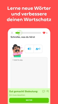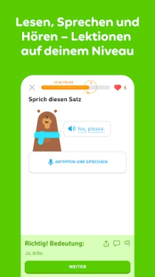 Bereiten Sie sich mit Duolingo auf eine Welt voller neuer Möglichkeiten vor. Entwickelt von einem Team aus führenden Sprachexperten, verwandelt Duolingo das Erlernen von Spanisch, Französisch, Mandarin, Italienisch, Deutsch, Englisch und vielen weiteren Sprachen in ein fesselndes Abenteuer. Ganz gleich, ob Sie für unvergessliche Reisen, akademische Erfolge, berufliche Aufstiege, die Verbindung zu Familie und Freunden oder einfach zur kognitiven Fitness lernen – Duolingo ist Ihr täglicher Begleiter auf dem Weg zu fließender Kommunikation und sprachlicher Kompetenz.
